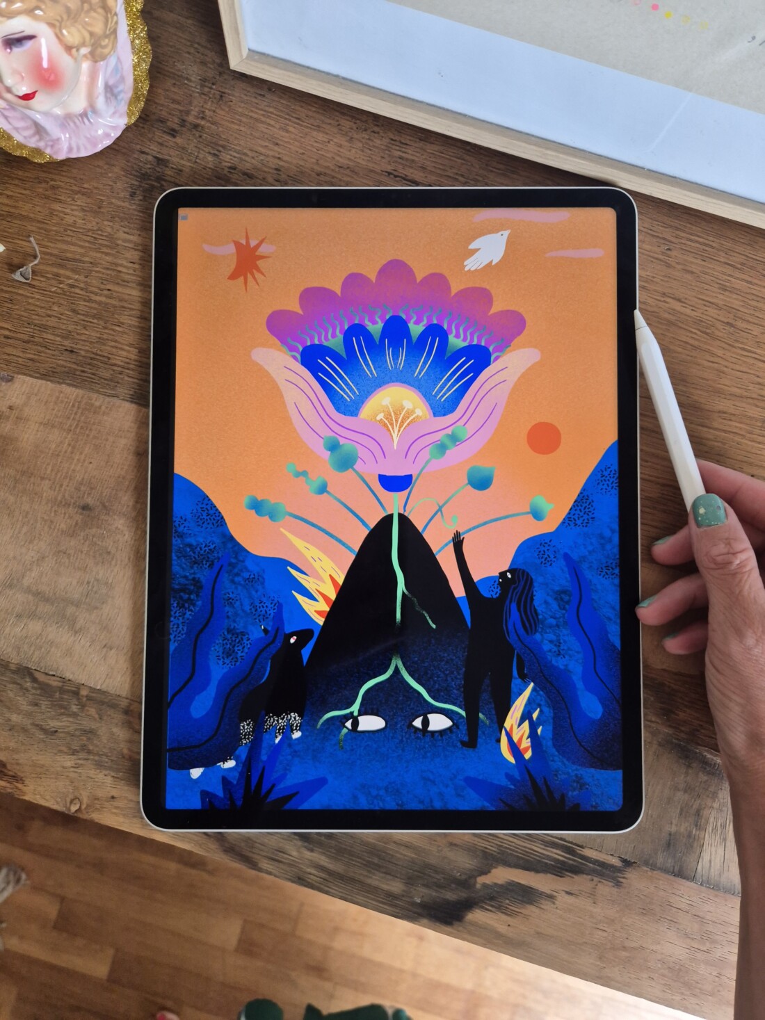 Si mes productions explorent la couleur et le mouvement, c’est que j’évolue dans un univers à la vitalité inspirante. Influencée par l’iconographie latino-américaine et l’art ibérique, j’aime l’expressivité des traits assurés et des aplats bigarrés qui placent mon travail en héritage du mouvement naïf.