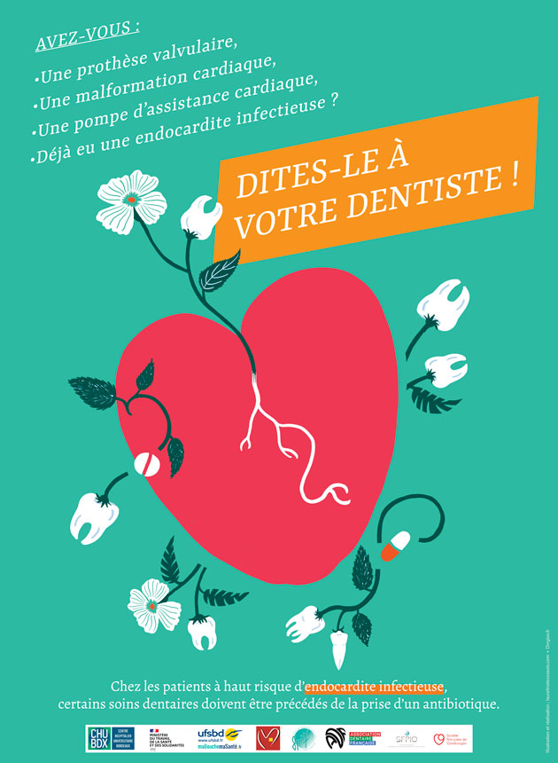 Un projet de campagne de communication commandé par le CHU de Bordeaux. À destination des dentistes, cette campagne est composée de plusieurs supports qui sensibilise à une meilleure prise en charge des patients atteints de certaines maladies du cour avant une opération chirurgicale dentaire.